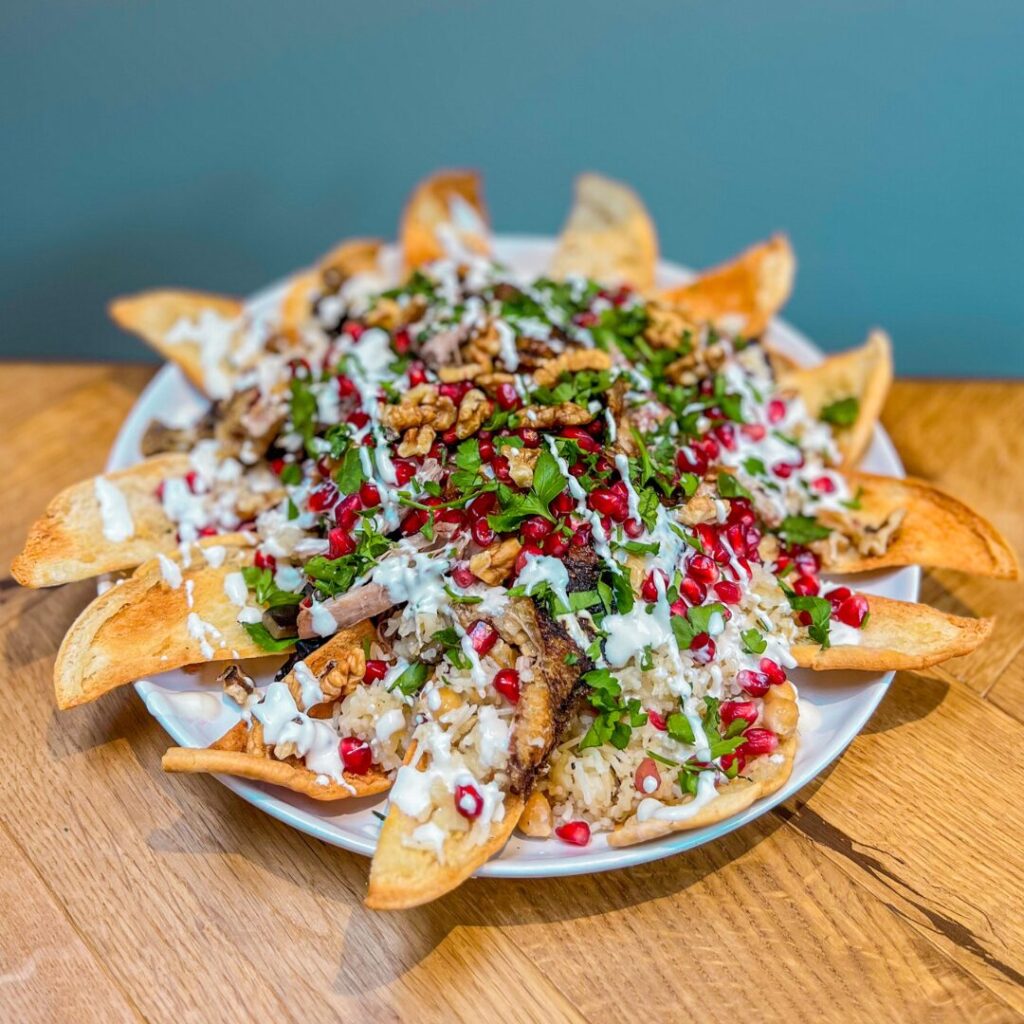 To serve, put the lamb on a chopping board, shred (removing any unpleasant bit s of fat). Arrange on a serving platter and moisten with a ladle of the cooking liquor. Cover the lamb with the aubergines, followed by the salsa and spoonfulls of yoghurt sauce, toasted nuts, pomegranate and sesame seeds, sumac and parsley.