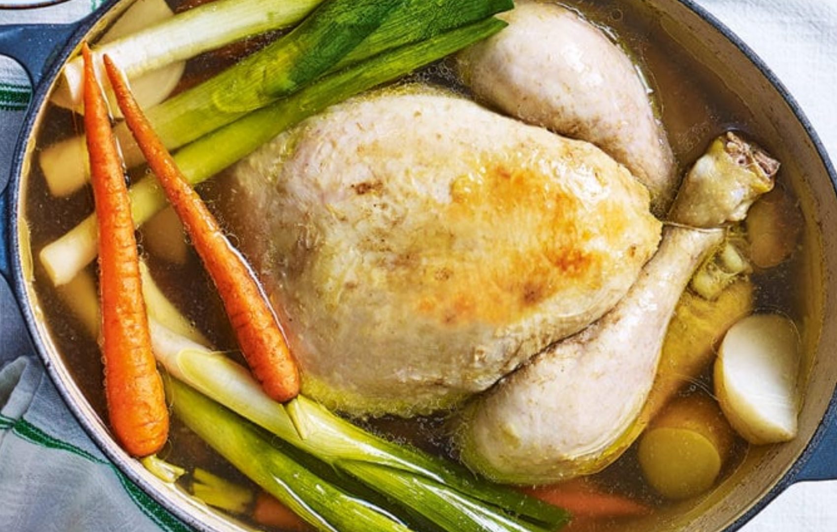 But with a carefully poached chicken you get perfectly cooked, moist meat suitable for all manner of dishes and, if you give it a blast in a hot oven before serving, it becomes a very superior cheat’s roast, with the added bonus of a saucepan of delicious broth for whatever’s on the menu the next day. Gentle poaching is also the perfect way to cook a slightly more mature organic bird which, it pains me to admit, can be a little dry.